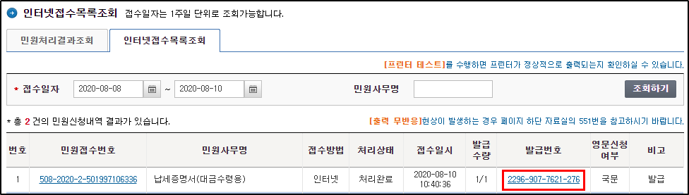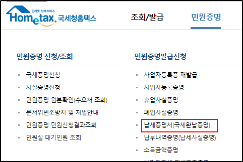 2. 민원증명 > 납세증명서(국세완남증명) 선택