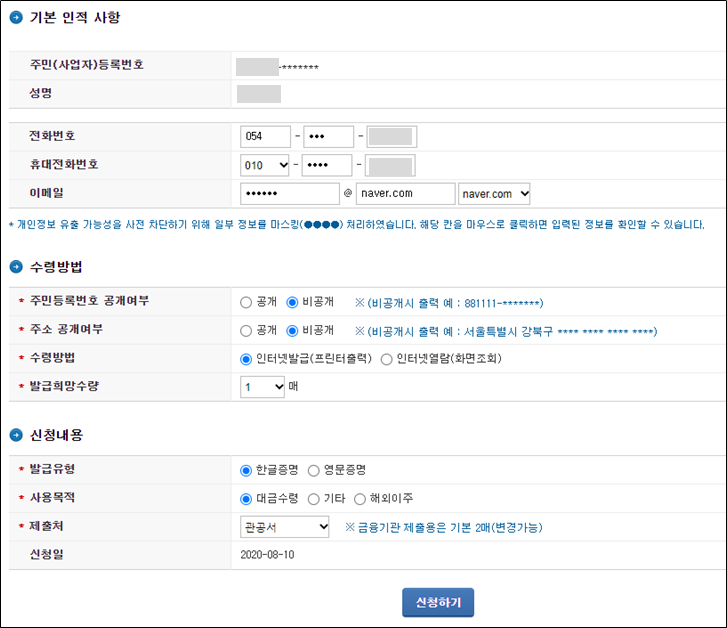 3. 기본 인적사항 작성 후 [신청하기]클릭